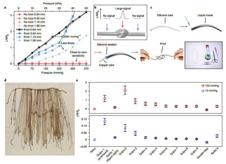 通过硅胶-液态金属压力传感器进行低成本胃肠测压,类似于奇普quipu。(小注:奇普quipu,是古代印加人一种结绳记事的方法,用来计数或者记录历史。由许多颜色的绳结编成的。这种结绳记事方法目前已经失传,复杂而隐秘)