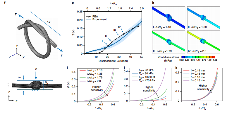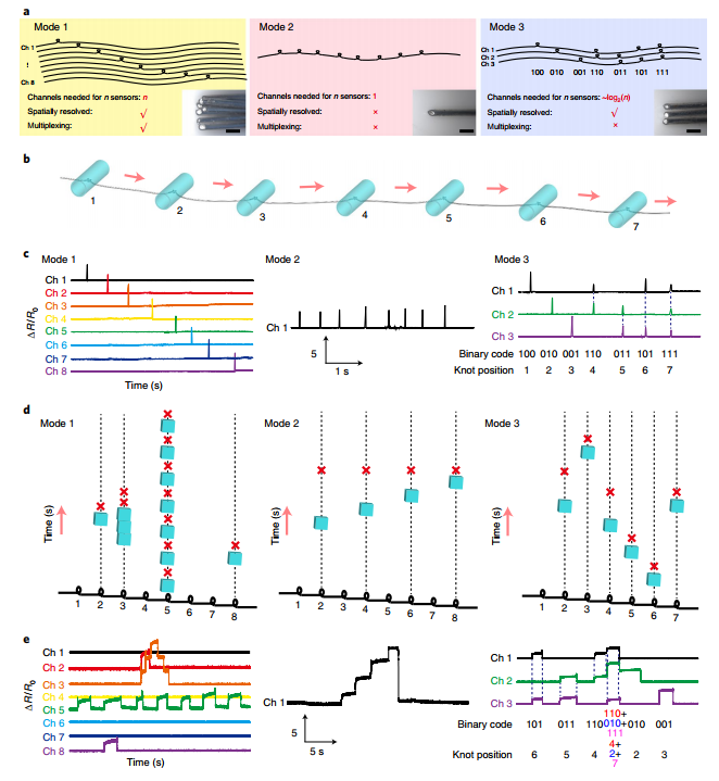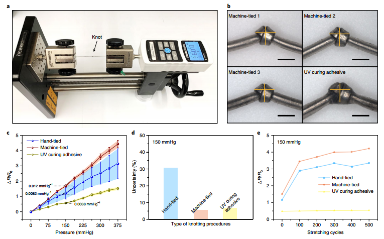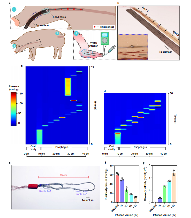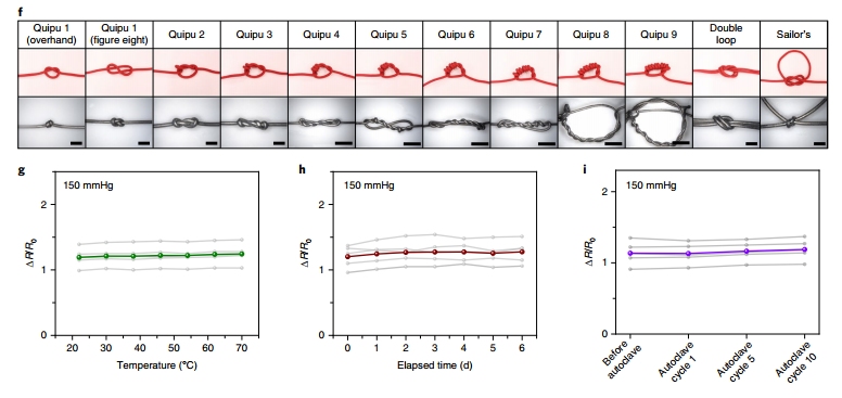 近日,麻省理工学院Giovanni Traverso团队Kewang Nan一作在Nature Biomedical Engineering上发文,报道开发了一种廉价且易于制造的导管类生物传感器,该设备用于捕获在人类胃肠道动态范围内的测压数据。这种设备设计类似于Quipu,即安第斯Andean文明用来捕捉和传输信息的打结线,并且是由打结的压阻压力传感器组成,这些传感器是通过薄硅胶管注入液态金属(共晶镓铟)制成的。通过探索一系列打结配置,确定了最佳设计方案,其传感性能与用于胃肠道测压的商业设备相当,并在麻醉猪胃肠道多个解剖部位,验证了胃肠道运动传感主要性能。一次性和可定制的压阻导管,可以扩大胃肠道测压在低资源环境中的应用。