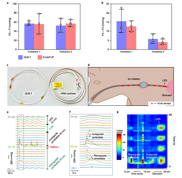 该项研究,融合液态金属的应用潜力,实现了奇普Quipu结绳仿生,开发了新型液态金属压力传感器(Quilt),用于在人类胃肠道的动态范围内实现所需压力灵敏度。这种简单的制造方案,可以使用基本的工作台工具完成,使设备成本低于每厘米0.26美元。