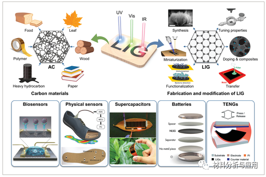 激光诱导石墨烯(LIG)是一种新出现的三维多孔材料,当激光束照射在某些碳材料上时产生。LIG表现出高孔隙率、优异的导电性和良好的机械灵活性。预先设计的LIG图案可以直接在各种碳材料上制造,其微观结构、表面特性、导电性、化学成分和杂原子掺杂都是可控的。这种选择性的、低成本的、无化学成分的、无掩模的图案技术最大限度地减少了原材料的使用,减少了对环境的影响,并实现了从学术到工业的广泛的应用。