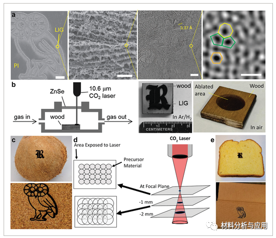 LIG已成为近年来石墨烯研究最活跃的课题之一。因此,了解石墨烯形成的潜在机制对于制备石墨烯基器件具有重要意义。石墨烯形成的机理很大程度上取决于激光和碳前驱体的特性。脉冲持续时间和波长是显著影响激光-材料相互作用的关键参数之一。大多数类型的激光器产生光热效应,即目标材料吸收入射光子能量并将其转换为热能。快速的能量沉积会产生极高的温度,并触发碳化、石墨化和剥落过程以形成 LIG。[值得注意的是,超短脉冲激光器可以诱导与碳前体的非线性相互作用,在环境空气中产生任意石墨烯图案。