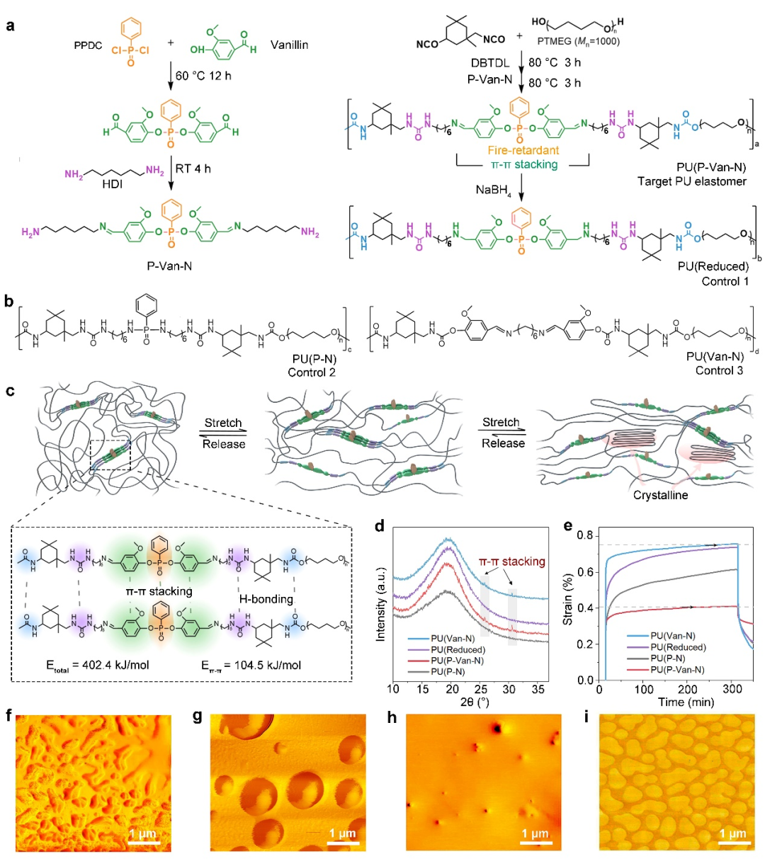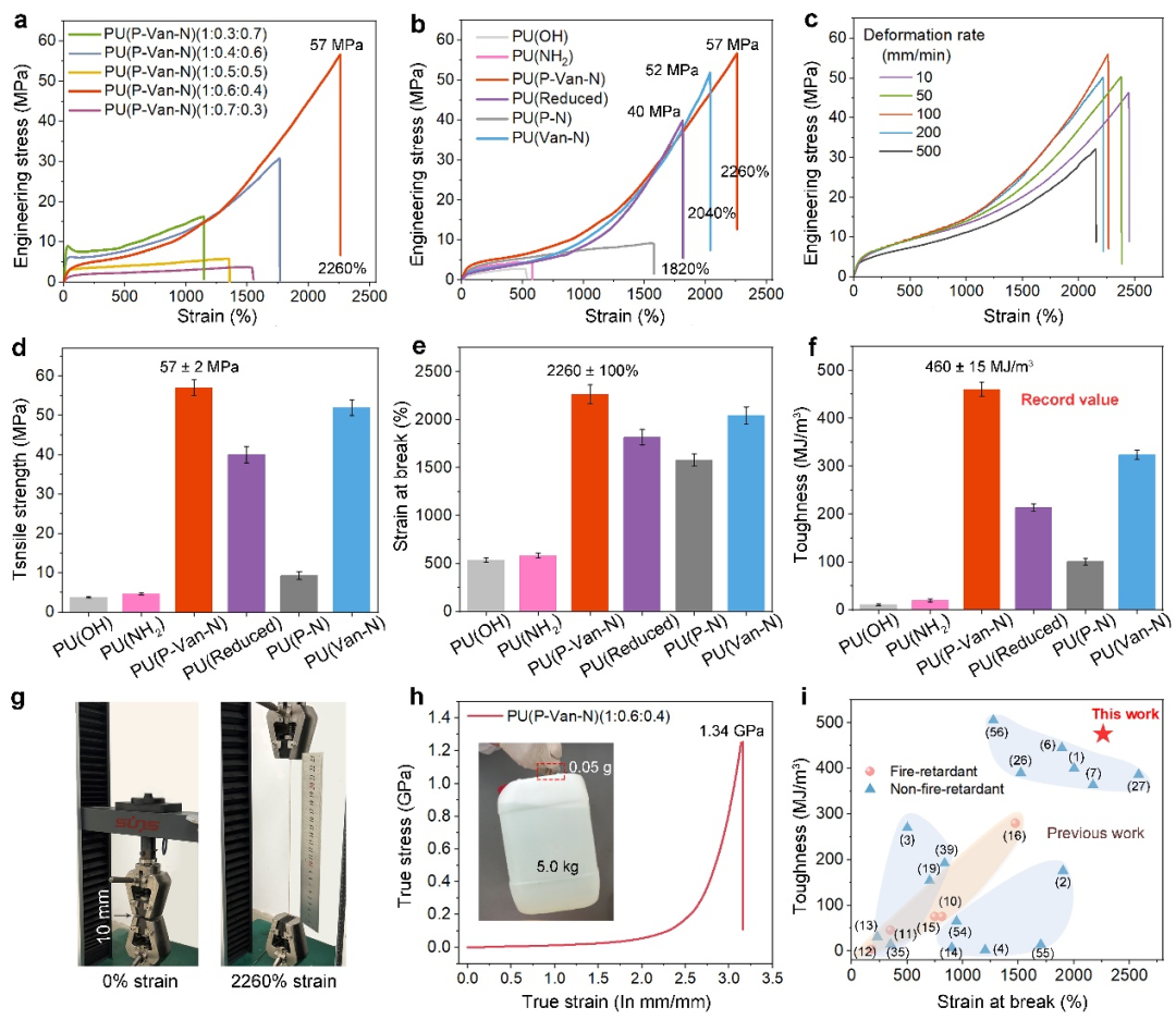 图1. 可拉伸、坚韧、阻燃聚氨酯弹性体PU(P-Van-N)的设计和表征. a) P-Van-N,PU(P-Van-N)和PU(Reduced)的合成. b) PU(P-N)和PU(Van-N)的结构. c) PU(P-Van-N)的拉伸机制. d) 室温下PUs的XRD谱图. e) PU(P-Van-N),PU(Reduced), PU(P-N)和PU(Van-N)的蠕变性能. f) PU(P-Van-N), g) PU(Reduced), h) PU(P-N)和i) PU(Van-N)的AFM高度图.