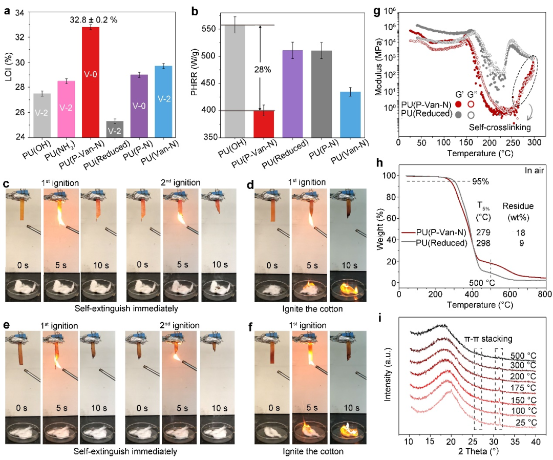 图3. 阻燃性能. PU弹性体的a) 极限氧指数和UL-94测试结果. b) PUs的热释放速率峰值. c) PU(P-Van-N), d) PU(Reduced), e) PU(P-N) 和 f) PU(Van-N)的UL-94测试结果. g) PU(P-Van-N)和PU(Reduced) 的储能模量 (G′) 和损耗模量 (G′′) 随时间的变化曲线. h) PU(P-Van-N) 和PU(Reduced) 在氮气氛围下的TGA曲线. i) PU(P-Van-N)在不同温度下的XRD谱图.