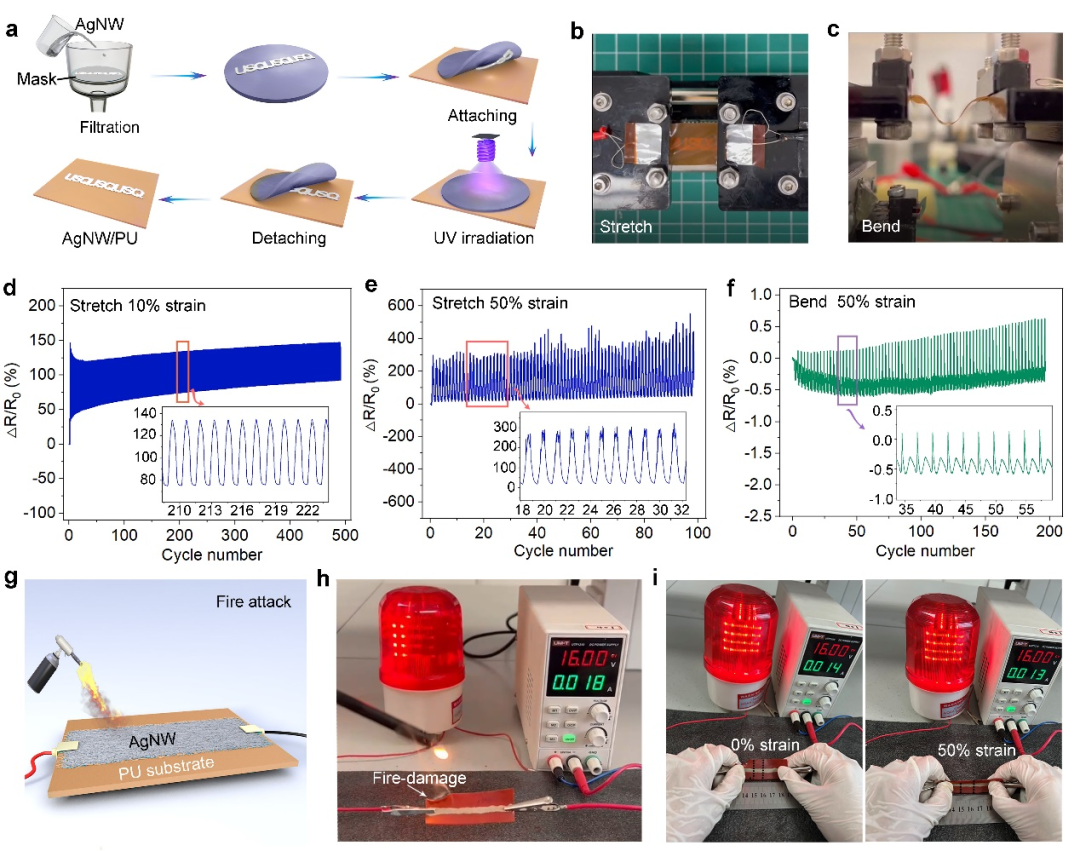 图4. PU(P-Van-N)作为柔性应变传感器基体的应用. a) AgNW/PU制备过程示意图. AgNW/PU b)拉伸和 c) 弯曲示意图. d) 在0%-10%应变之间拉伸-松弛500次的瞬态电阻变化值. e) 在0%-50%应变之间拉伸-松弛100次的瞬态电阻变化值. f) 在10 mm到5 mm之间弯曲-松弛200次的的瞬态电阻变化值. g) AgNW/PU遭受火袭击示意图. AgNW/PU在0%和50%应变下h)点燃时和 i) 点燃后的可导电性.