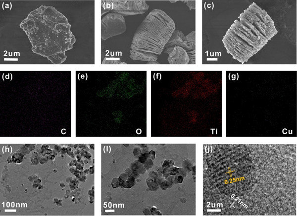 图1. (a) MAX; (b) MXene的SEM图;Cu2O/Cu@MXene的(c) SEM图;(d-g)元素映射图;(h-i) TEM图;(j) HRTEM图。
