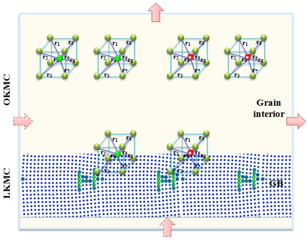 在以往的多尺度模拟中,人们往往将晶界抽象为没有具体结构的二维平面,因而采用静态计算获得缺陷与晶界的相互作用参数,如形成能、结合能、迁移能垒等,以此来表征晶界的结构特征以及缺陷的演化特性。但晶界特征的多样性使得不同种类的晶界往往呈现出截然不同的局域结构与缺陷性质。如果将这些性质简单地抽象为单一的作用参数,会遗漏掉许多与缺陷相关的原子信息,进而影响长时间尺度下缺陷演化的正确预测。鉴于此,科研人员发展了一种既能分辨晶界处缺陷性质的空间位置相关性,又能粗粒化处理远离界面区域缺陷演化的模拟方法,即所谓杂化LKMC和OKMC模拟技术(图1)。