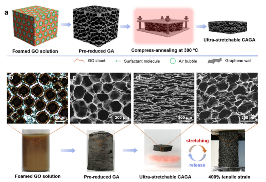 近日,青岛科技大学高分子学院张建明教授团队等在材料领域知名期刊《Materials Horizons》(影响因子15.717,中科院分区材料1区)发表了题为“Ultra-stretchable graphene aerogels at ultralowtemperatures”的研究论文(DOI: 10.1039/d3mh00014a)。高分子学院硕士研究生杨国徽和张晓方副教授为共同第一作者,杨洪生副教授和宗鲁副教授为共同通讯作者。