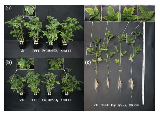 图3. 喷施去离子水(CK)、传统肥料(TFFF)、硅基载体(Fe(III)/SiO2)和新型亚铁肥(ORFFF)溶液对缺铁番茄幼苗的矫正效果对比照片。(a)施肥前,(b)模拟两次雨水冲刷后,(c)收获时的数码照片。 该系列研究工作为进一步掌握纳米结构对营养元素的高效递送、实现化肥的“减施增效”农业双碳目标以及为未来“纳米农业”的发展提供新的启示。
