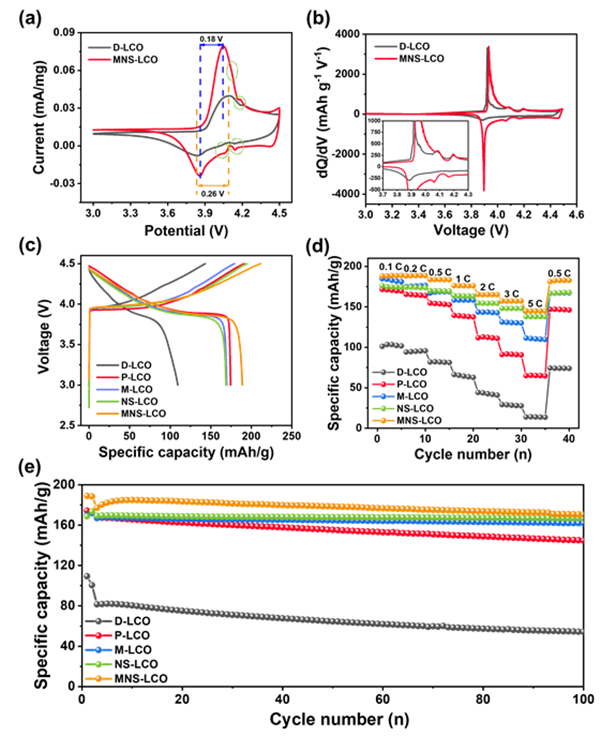 图2. (a) 扫描速率为0.1 mV/s时D-LCO和MNS-LCO的CV曲线;(b) 0.1 C时D-LCO和MNS-LCO的dQ/dV曲线;(c) D-LCO、P-LCO、M-LCO、NS-LCO和MNS-LCO在0.2 C时的首圈充放电曲线;(d) 3.0 ~ 4.5 V不同电流密度下的倍率性能;(e) D-LCO、P-LCO、M-LCO、NS-LCO和MNS-LCO在0.5 C下的循环性能。