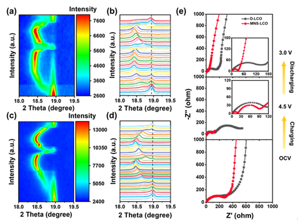 图3. 在OCV ~ 4.5 ~ 3.0 V电压范围内, 0.2 C初始充放电过程中,D-LCO (a-b)和MNS-LCO (c-d) 的原位XRD;(e)初始循环过程中在OCV、4.5 V和3.0 V时检测到的D-LCO和MNS-LCO的EIS谱图。