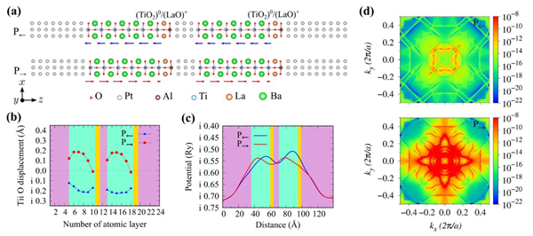 图1. (a) 双势垒铁电隧道结两种极化态的原子结构,结构下方的箭头表示BaTiO3局部极化的方向和大小;(b) BaTiO3中每一层TiO2沿z方向的Ti-O位移;(c) 铁电左、右极化态沿z方向的平均静电势能分布,(b)和(c)中的粉色、青色和黄色背景分别代表Pt、BaTiO3和LaAlO3;(d) 费米能级处双势垒铁电隧道结左右极化态下二维布里渊区中的k∥分辨透射系数。