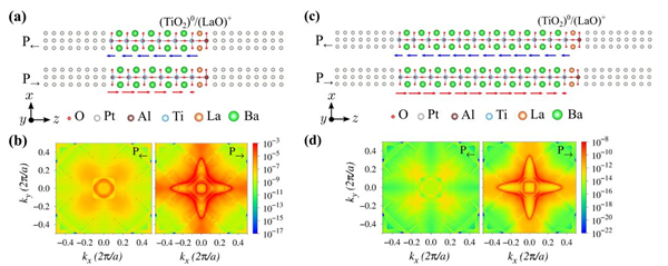 图2. (a)和(c) BaTiO3厚度分别为5.5单胞、11.5单胞时单势垒铁电隧道结的原子结构和BaTiO3局部极化;(b)和(d)两种体系在费米能级处左右极化态下的二维布里渊区k∥分辨透射系数。