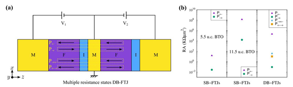 图3. (a) 多电阻态双势垒铁电隧道结结构示意图,其中金属(M)、铁电体(F)和插层(I)分别用黄色、紫色和蓝色表示,V1和V2表示用于控制单个铁电势垒极化方向的偏压,四个黄色虚线框中的箭头表示多电阻态双势垒铁电隧道结的四种极化状态分别用P←、P→、P→←、P←→表示;(b) BaTiO3厚度分别为5.5单胞、11.5单胞的单势垒铁电隧道结和多电阻态双势垒铁电隧道结在不同极化状态下的电阻面积乘积。