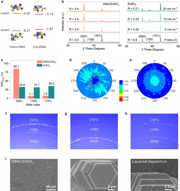 图2. (a)Cis-DMA和trans-DMA的LUMO和HOMO能级;(b)不同电流密度和不同电解液中沉积锌片的XRD图谱(R = I(002)/I(101));(c)不同电解液中沉积锌片的RTC值;(d, e)在不同电解液中沉积锌片的X射线极图;(f-h)不同电解液中沉积锌片的2D-GIXRD图谱:(f)ZnSO4中沉积的锌片,(g)DMA/ZnSO4中沉积的锌片,(h)在DMA/ZnSO4中循环10圈后的锌片;(i)不同电解液中沉积锌片的SEM和FESEM图。