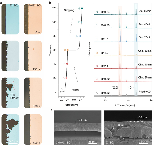 图3. (a)10 mA cm−2下ZnSO4和DMA/ZnSO4电解液中沉积的原位光学显微观察图;(b)10 mA cm−2下DMA/ZnSO4电解液中半原位沉积XRD图谱;(c)10 mAh cm−2下ZnSO4和DMA/ZnSO4电解液中沉积锌片的侧面SEM图。