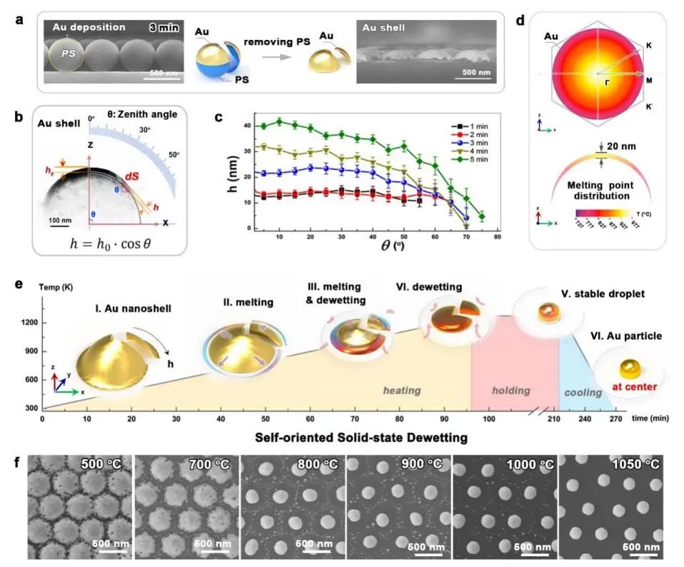 图1. 球形金纳米壳的自限域脱湿机制:(a)通过金沉积和随后用溶剂去除球形PS模板获得的金纳米壳的SEM图像;(b)从(a)中提取的典型金纳米壳的透射电镜图像;(c)金纳米壳厚度与测量角度和沉积时间的关系分析;(d)理论模拟了厚度对金纳米壳熔点梯度的影响;(e)金纳米壳在退火处理过程中自发脱湿成稳定在晶格全球领先的电竞赛事平台的金纳米粒子的示意图,定义为自限域脱湿过程;(f)在不同温度下退火的一系列SEM结果观察到金纳米壳演变成ncp阵列。