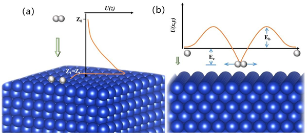 图1. H2在Cu(001)面由于法向平移运动(a)和横向振动(b)引起的活化解离过程。