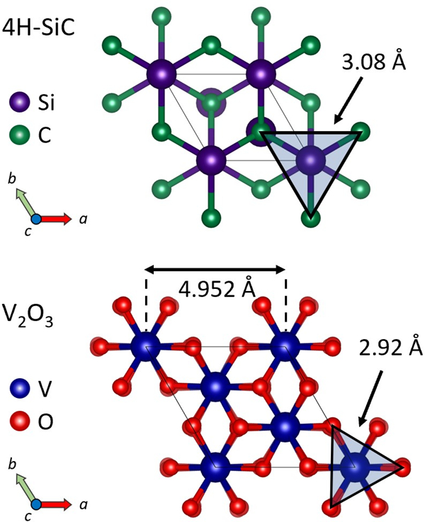 图1. V2O3和4H-SiC (001)平面示意图。