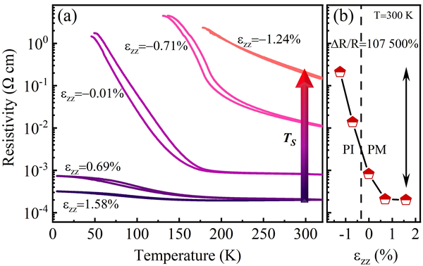图2. 不同应力状态下V2O3/4H-SiC薄膜的电阻率-温度关系(a)和室温电阻率随应力变化关系(b)。