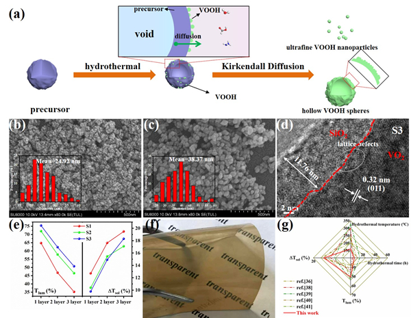 图1. (a) Kirkendall效应制备超细VOOH示意图;(b) VOOH和(c) VO2(M)的SEM图像;(d) VO2@SiO2的TEM图像;(e) VO2@SiO2/PVP薄膜的光学性能数据;(f) VO2基柔性薄膜;(g) 热致变色性能对比雷达图。