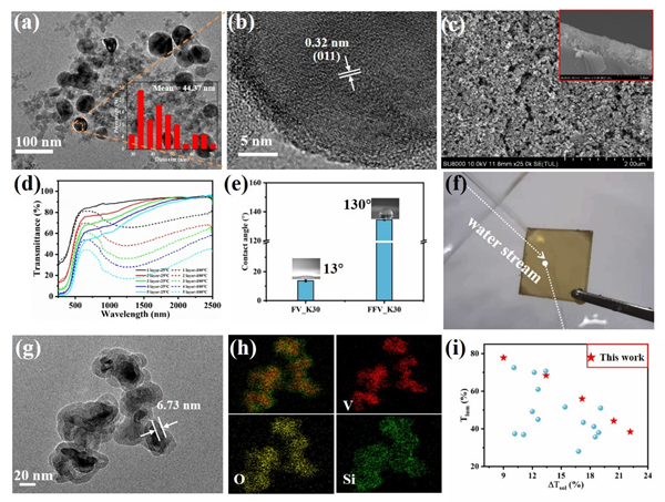 图2. (a-b) FS限域退火的VO2(M)的TEM图像;(c) 聚合物辅助退火的VO2(M)的SEM图像;(d) 不同厚度薄膜的高低温透过率曲线;(e-f) 聚合物辅助退火的VO2(M)薄膜的疏水性能测试;(g-h) VO2@SiO2的TEM图像和能谱分析;(i) 热致变色性能对比。
