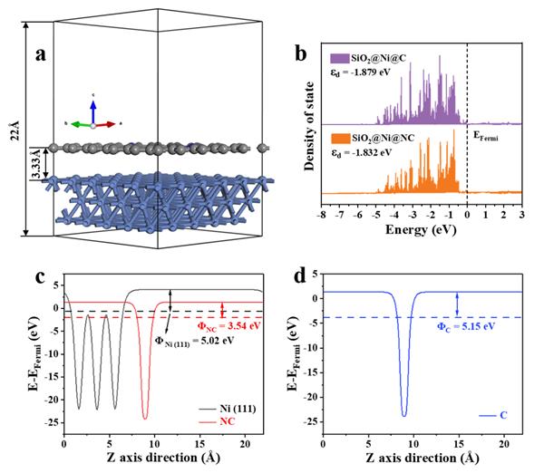 图3. (a) SiO2@Ni@NC的计算模型图;(b) SiO2@Ni@C和SiO2@Ni@NC的态密度;(c) Ni (111)晶面和NC以及(d) C的功函数。