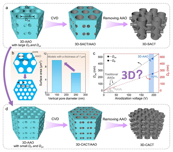 研究团队系统研究了精确控制3D-AAO模板孔结构的方法,通过调控阳极氧化条件(包括电压、电解液组成和浓度以及温度等),成功实现了3D-AAO的垂直孔的孔径在70 – 250 nm、垂直孔之间的间距在100 – 450 nm范围内连续可调。利用3D-AAO模板辅助化学气相沉积法,制备了高排列密度的三维互连碳管(简称3D-CACT)纳米阵列电极。BET测试结果表明,减小垂直管径和间距,能够有效地提高电极的比表面积。
