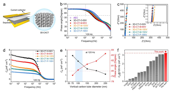 综上所述,基于高密度三维互连碳管纳米阵列电极的双电层电容器具有优异的滤波性能,有望为高性能滤波电容器的研究提供新思路,推动小型化电力系统和电子器件的发展。此外,该研究提出的结构可调模板辅助法在纳米材料的尺寸定制化制备和开发可集成微器件方面具有较大应用潜力。 上述工作得到国家自然科学基金委和合肥物质院院长基金等资助。