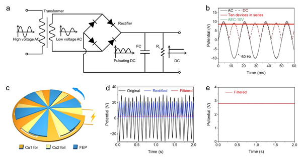滤波电容器在实际应用中,常常需要满足高额定电压的要求。因此,科研人员对标6.3 V和10 V的商用铝电解电容器,分别将六组和十组相同的基于3D-CACT电极的器件进行串联,以扩展电容器的工作电压。测试发现,器件串联后仍保持较好的频率响应性能,并具有较短的弛豫时间和较低的损耗。该结果表明所制备的电容器具有高稳定性和均匀性,在串联时能够保持稳定的性能,具有实际应用潜力。随后,科研人员以十组串联器件为滤波器,进行交流滤波应用演示,以验证器件的滤波性能。研究发现,器件能够将正弦型的市电和其它各种不同类型的输入交流信号(如方波、三角波和噪声波等)滤波为平滑的直流信号,滤波效果可与商业AEC相媲美。此外,科研人员自制了旋转式摩擦纳米发电机来模拟环境中的不连续脉冲交流输出,验证了滤波电容器组对该信号同样具有出色的脉冲平滑能力。