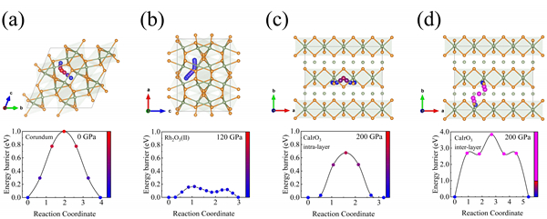图. 氢原子在corundum (a)、Rh2O3(II) (b)、CaIrO3层内(c)和层间(d)中的扩散路径和能垒。