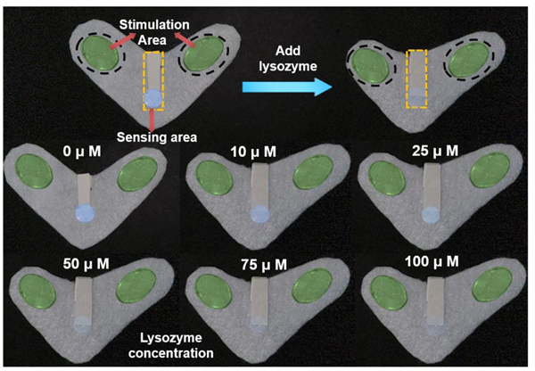图2. 基于Eu-Dy MOF凝胶眼贴的实物图及添加不同浓度溶菌酶后发生的荧光颜色变化。